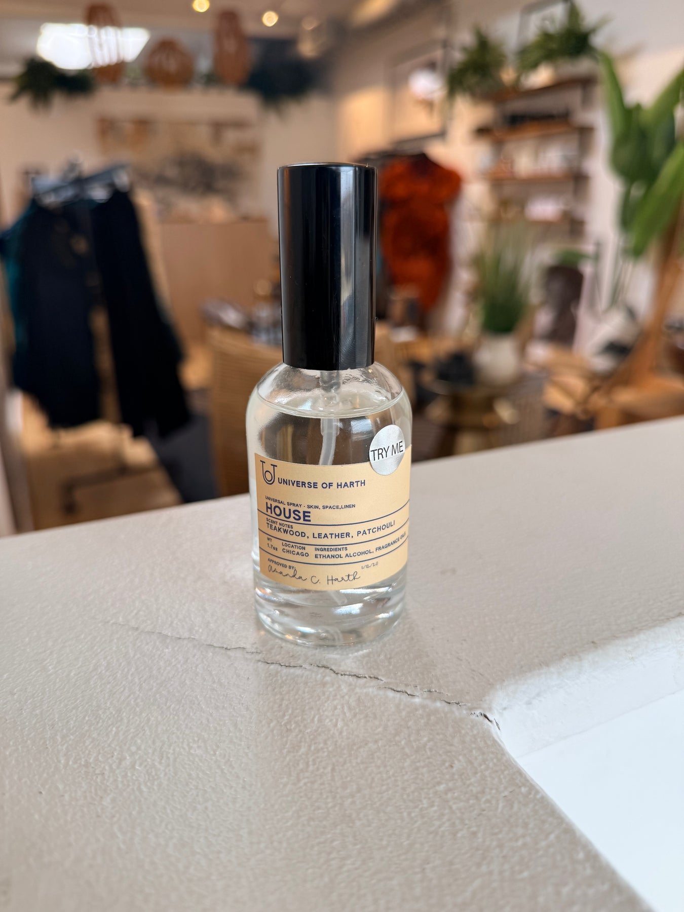 Notes: Teakwood, Leather, and Patchouli Memories of home inspire House a scent that is warm and smokey. A lasting note of leather is added to balance the woody notes in Teakwood and Patchouli. It’s a neutral fragrance that burns well when you first get home after a long day and when you want to spend the night in. Our Universal Spray is skin safe, great on linens, and brilliant as a room spray.