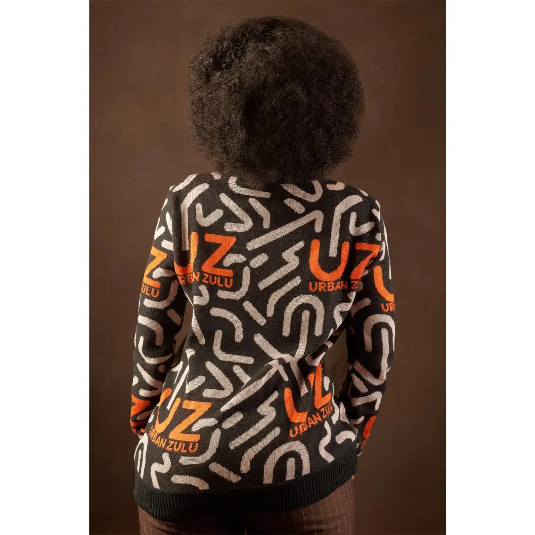 The UZ Jersey Sweater by Urban Zulu showcases a knitted design inspired by Kuba cloth prints. Pair it with the UZ Slack Pants to complete your stylish look.
