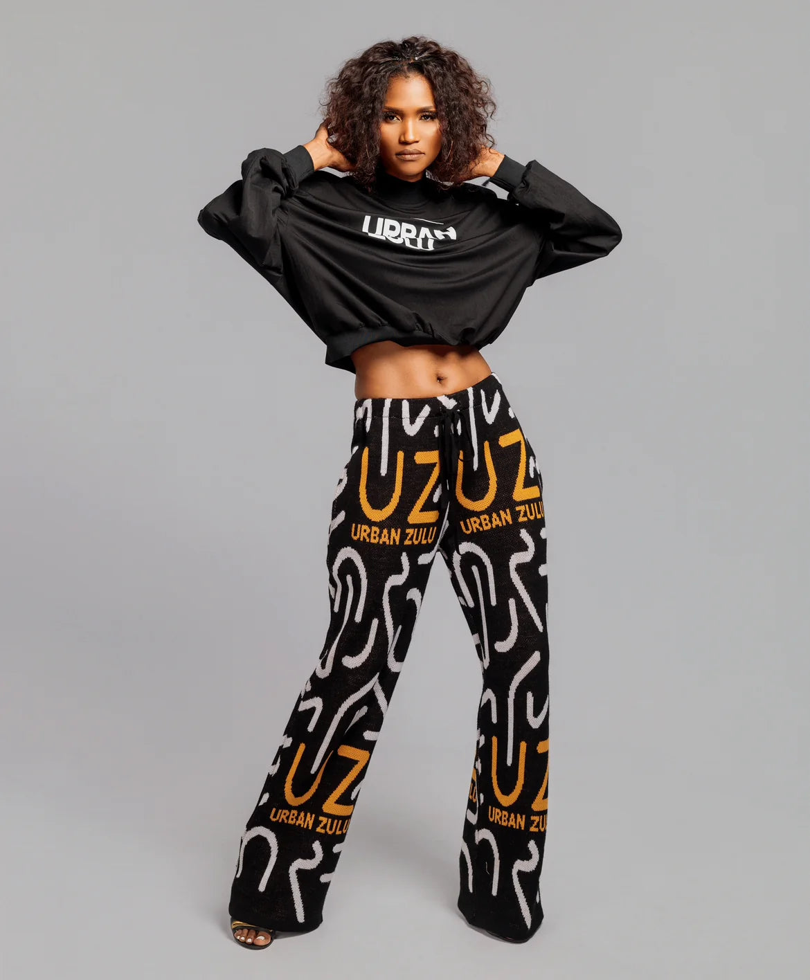 Experience the UZ Slack Pant, featuring a knitted design inspired by Kuba Cloth and Urban Zulu prints. It includes a convenient drawstring waist and practical side pockets for everyday ease.