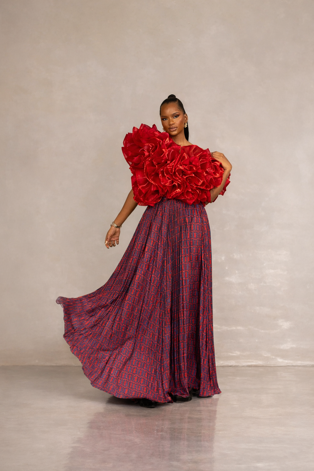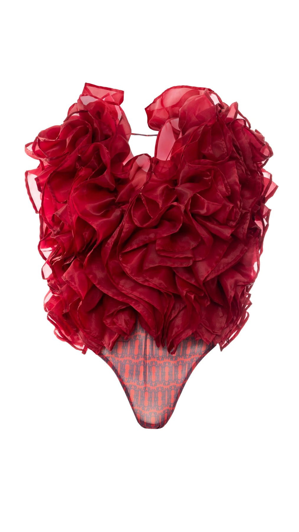 This Flora Bodysuit is a stylish and versatile piece, expertly crafted from luxurious organza and scuba knitted fabric. The unique ruffle detail adds a touch of elegance and can be effortlessly paired with the Flora Skirt for a complete look. Stay in fashion and comfort with this must-have bodysuit.