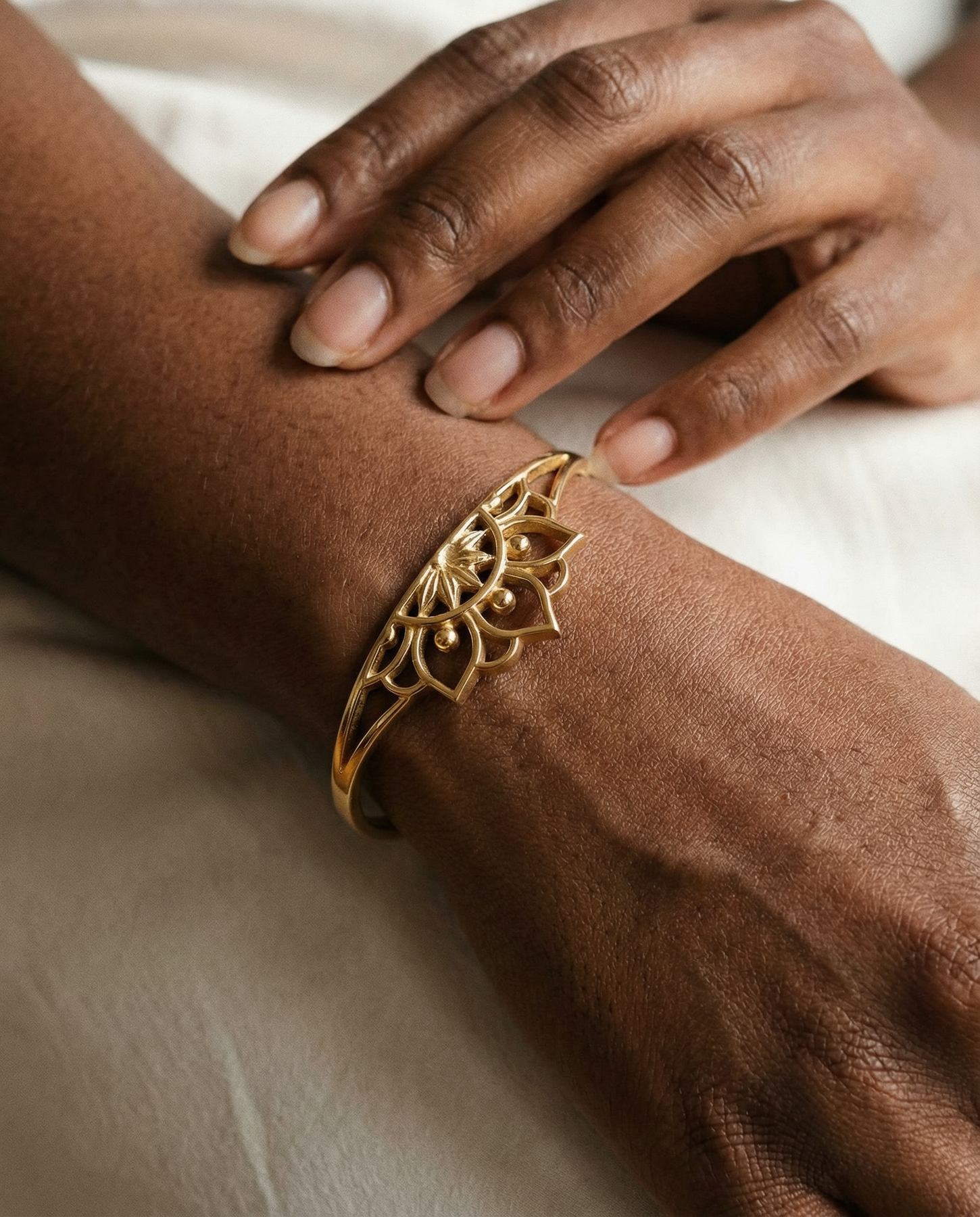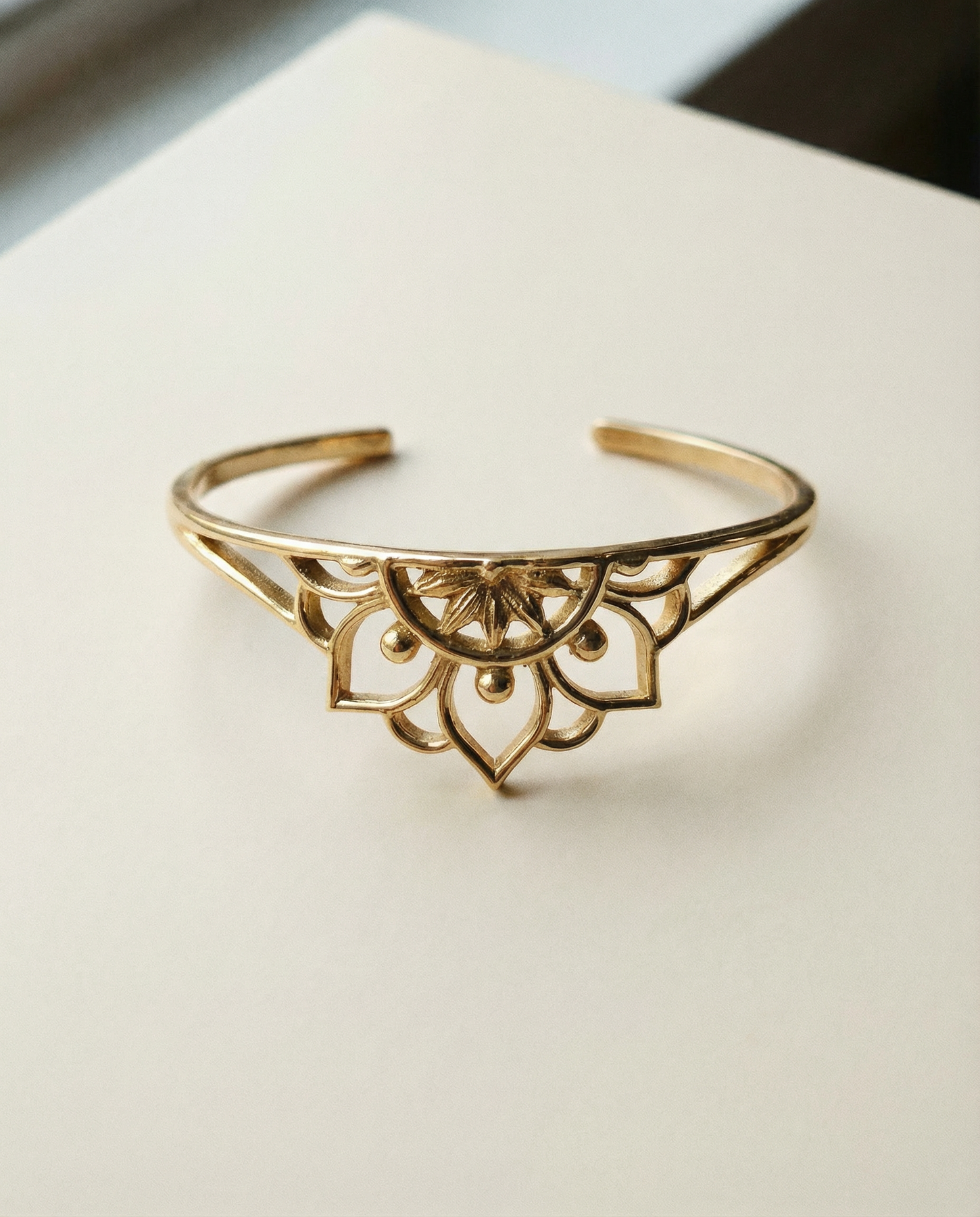 The Brass Decorated Lotus Cuff Bracelet is a piece that beautifully combines tradition with innovation. This soulful, spirited accessory is handmade by empowered artisans in India. Crafted with brass.