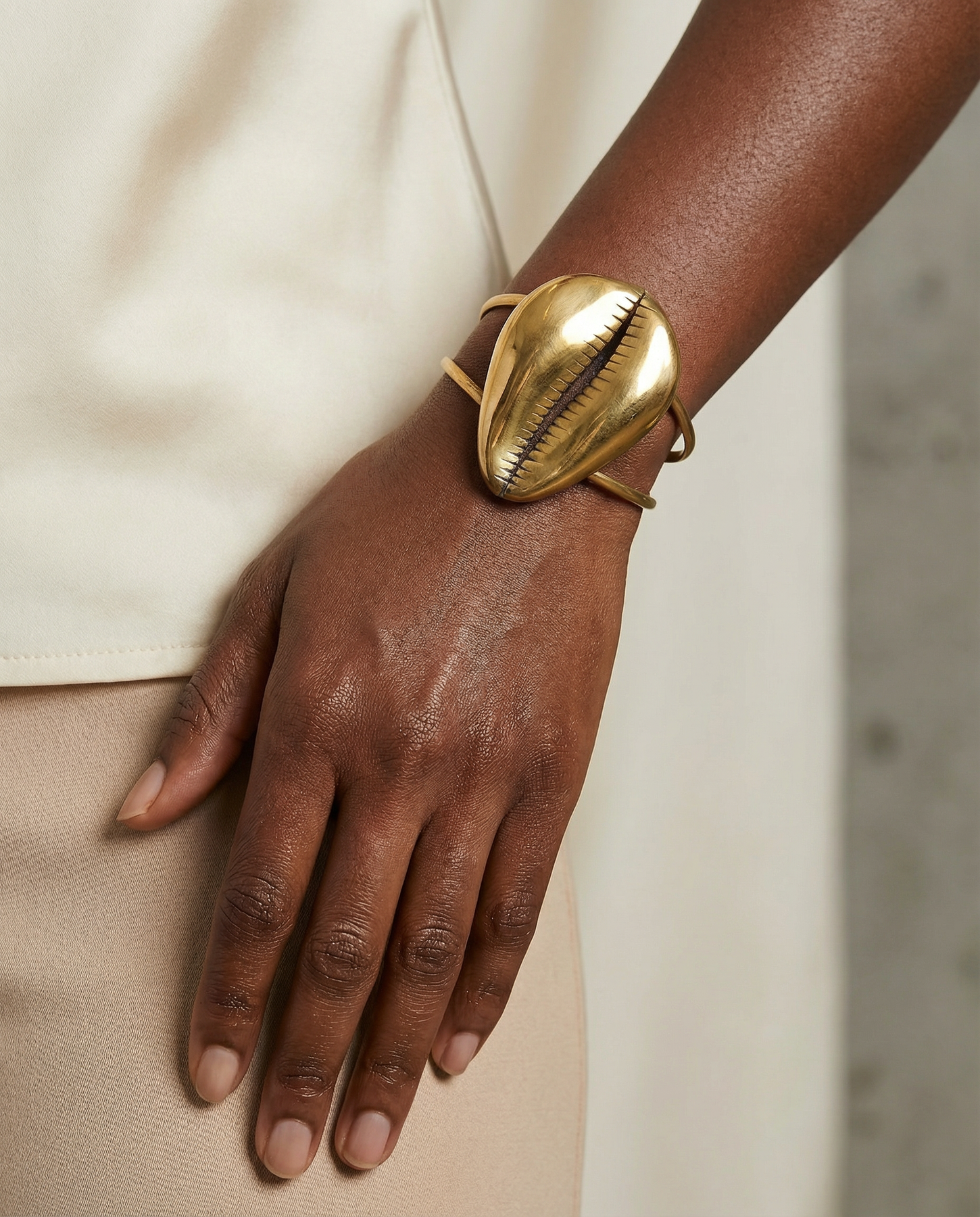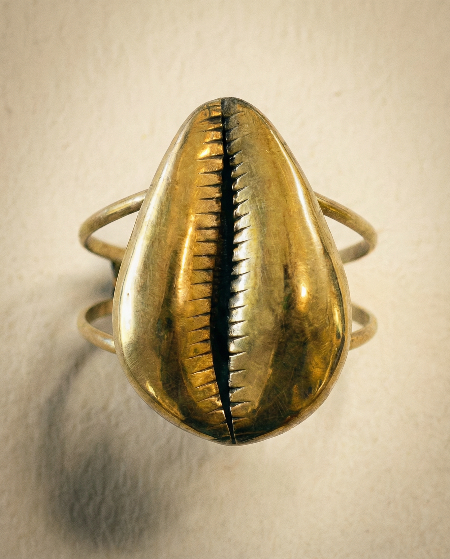 Authentic handmade cowrie cuff bracelet sourced from Dakar, Senegal. Crafted in brass with traditional techniques, this large piece celebrates West African heritage and timeless style. Wear it solo or layered for bold, meaningful impact.